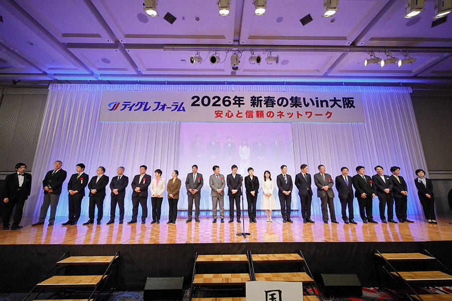 レポート新春の集い 2026年01月06日 「ティグレフォーラム 2026 新春の集い in大阪」懇親会開催 2026年1月6日、ティグレフォーラム「2026年新春の集いin大阪」にて第一部の新春講演会に引き続き、懇親会が開催されました。第一部で講演をいただいた矢田わか子さんからもご挨拶を頂きました。ティグレ会員の皆様を中心に、衆参の国会議員をはじめとする各首長及び各級議員の方々、各商工団体、各専門士業、民主団体の方々など、約700名の参加がありました。 上田良子ティグレ連合会理事長挨拶 矢田わか子さんのご挨拶 懇親会会場の様子 2025年に新たに就任したティグレ連合会上田良子理事長の開会挨拶後に、各党を代表して、下記の方々からそれぞれご挨拶をいただきました。 各政党代表挨拶 国会議員団登壇の様子 自由民主党中山泰秀元防衛大臣 日本維新の会共同代表藤田文武衆議院議員 立憲民主党大阪府総支部連合会代表森山浩行衆議院議員 公明党幹事長石川博崇参議院議員 国民民主党向山好一衆議院議員 社会民主党大阪府連合会長崎由美子代表 市町村長・自治体議員挨拶 各政党の代表挨拶ののち、各市町村長を代表して澤井宏文(さわいひろふみ)松原市長からご挨拶があり、自治体議員を代表して金城克典(きんじょうかつのり)第118代大阪府議会議長からご挨拶をいただきました。 地方議員団登壇の様子 各市町村長を代表して澤井宏文松原市長からご挨拶 自治体議員を代表して金城克典第118代大阪府議会議長からご挨拶 乾杯は井尻雅之(いじりまさゆき)連合大阪会長のご発声で行われました。アトラクションは新沼謙治さんの歌謡ショーが行われ、会場は大いに盛り上がりました。閉会の挨拶は税理士法人ティグレパートナーズの中村潤一郎(なかむらじゅんいちろう)代表社員の中締めあいさつで、盛会のうちに散会しました。 井尻雅之連合大阪会長による乾杯のご発声 税理士法人ティグレパートナーズ中村潤一郎代表社員による中締めあいさつ ティグレフォーラム「2026年新春の集い in大阪」第一部はこちら